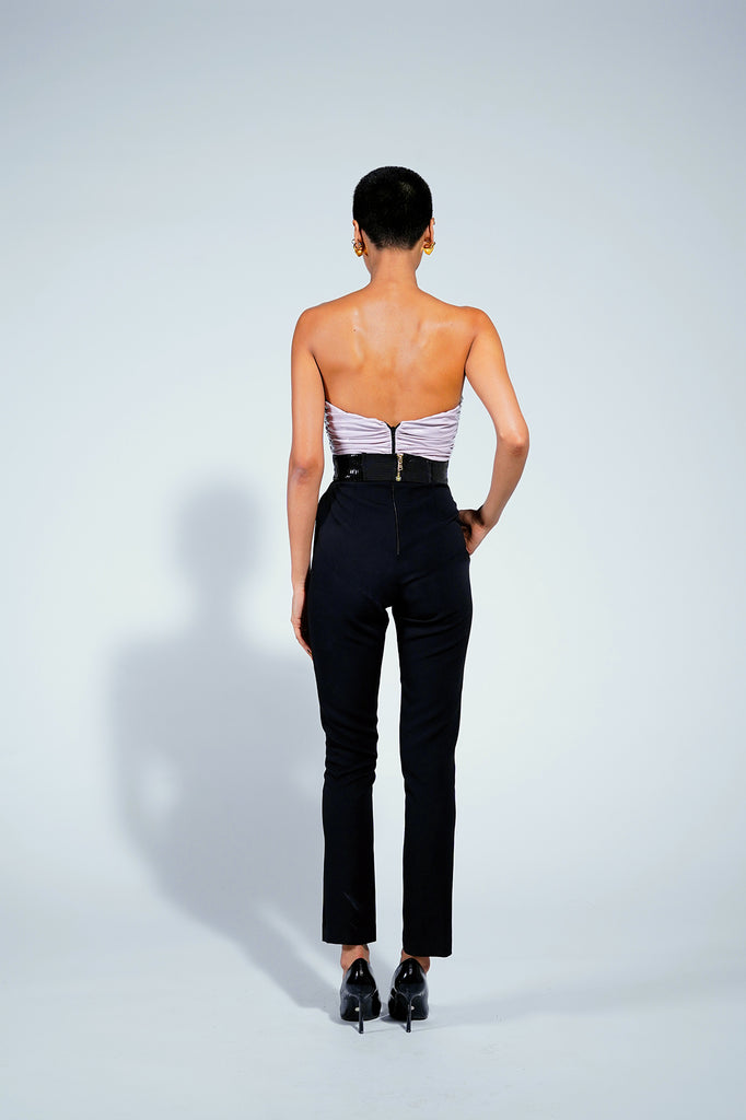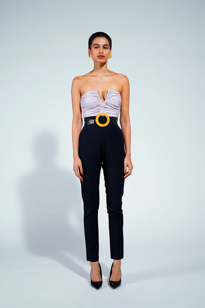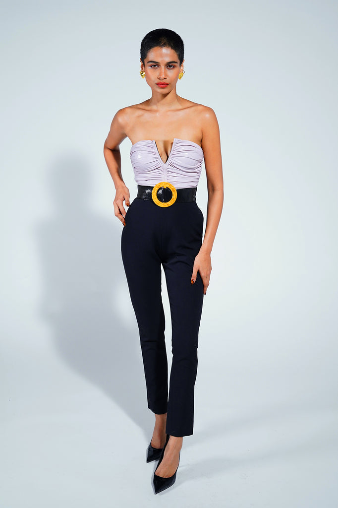 Featuring a jumpsuit with latex gathered tube top with a plunge V cut at the front panel and tapered trousers.
