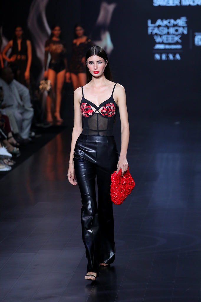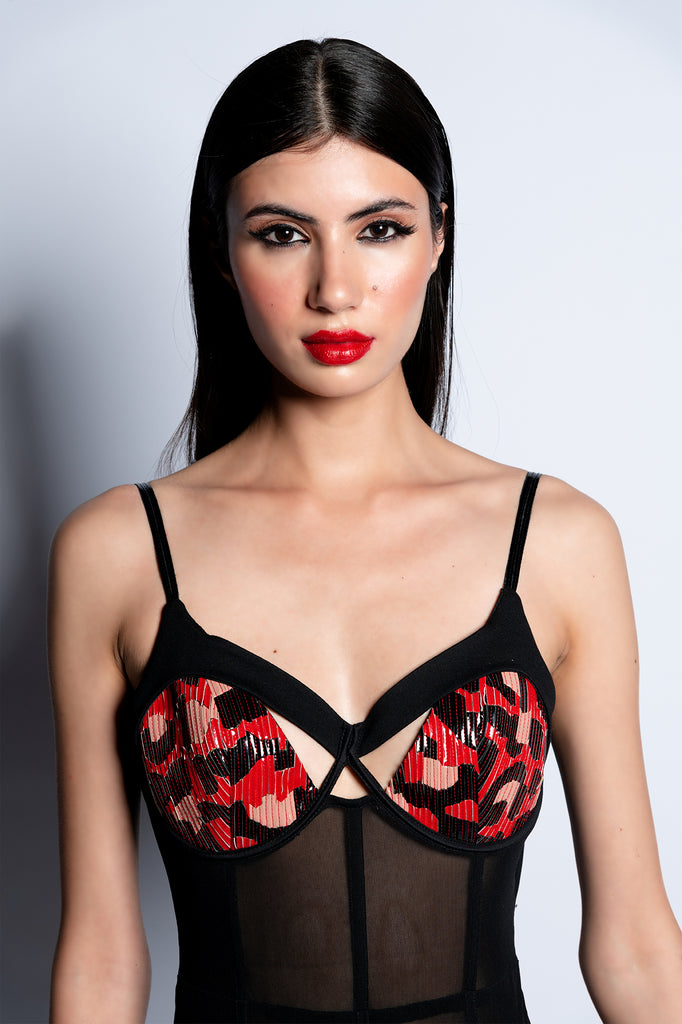 Featuring a mesh corset bodysuit, with faux leather leopard textile cups and adjustable straps.