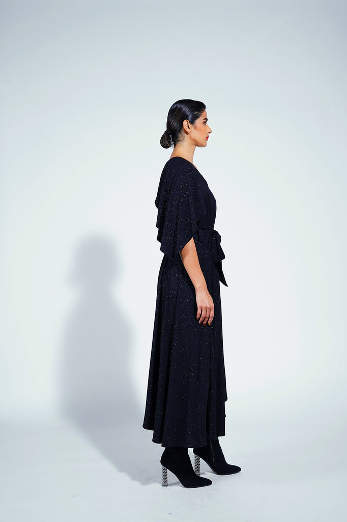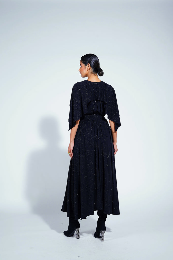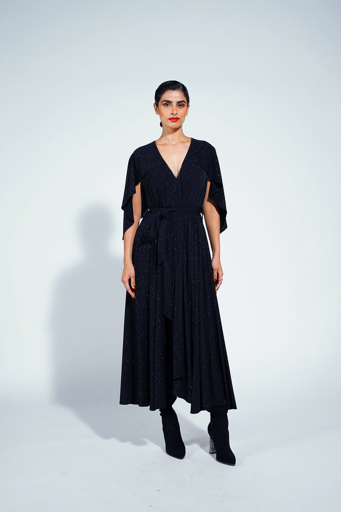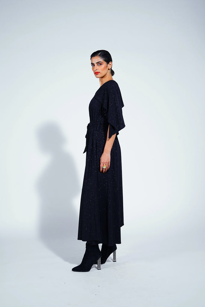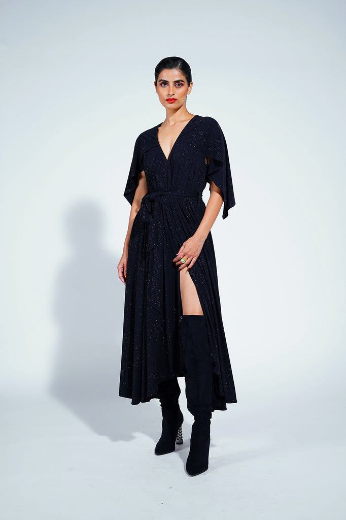 Featuring a dress with shimmer fabric, cape cut sleeves and high low hem with a subtle tie up and plunge neckline, keeping things effortless with it's elegant charm.