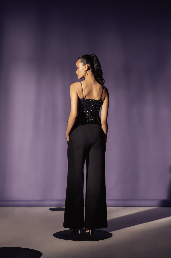 Featuring a classic monochromatic black jumpsuit with ruched corset bustier extending to a lava leather peplum with pearl embroidery on the body. Fitted at the waist, it falls to flared trousers as the bottoms.