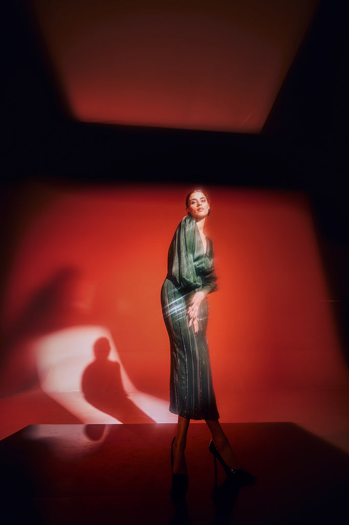 Featuring a semi fitted dress with a heavy textured pencil skirt with leather lines and a relaxed top with plunge neckline and bishop sleeves, making it just the perfect dress for your formal evening.