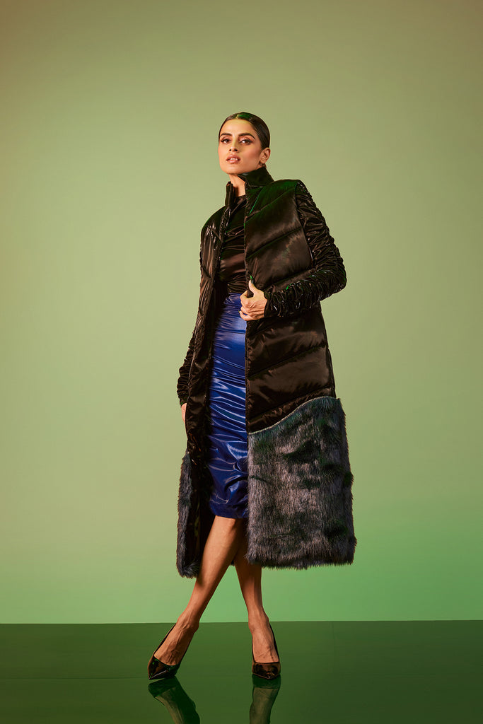 Featuring a quilted long gilet with fur bottom and glitter cord seam, a versatile throw on jacket for the season!