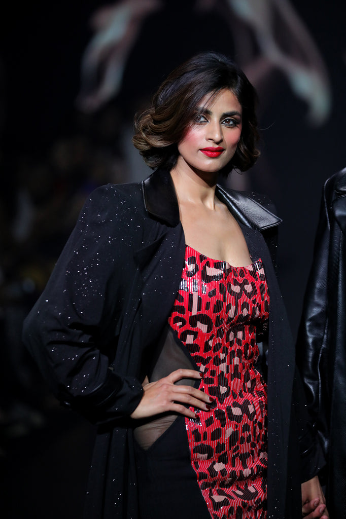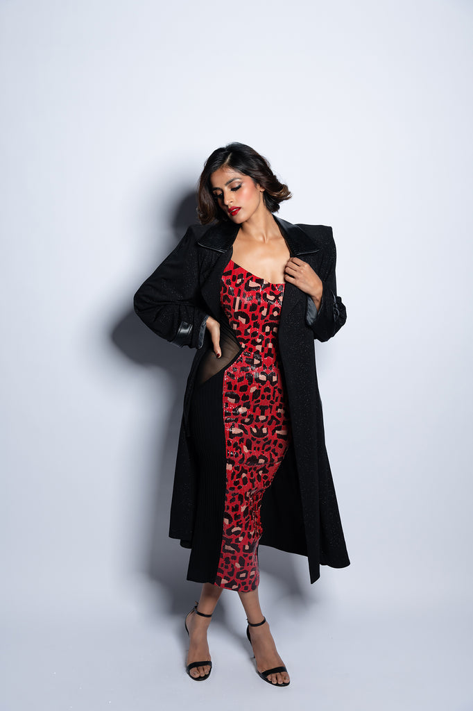 Featuring a black shimmer evening wrap around trench with faux croc leather collar  detailing and exaggerated shoulder pads to complete the look.