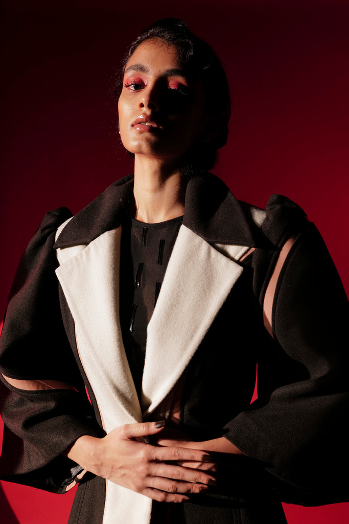 Featuring a Monalisa and Eve contrasted over-coat with puff sleeves and accent pink faux-leather asymmetrical inserts on the body and sleeves.