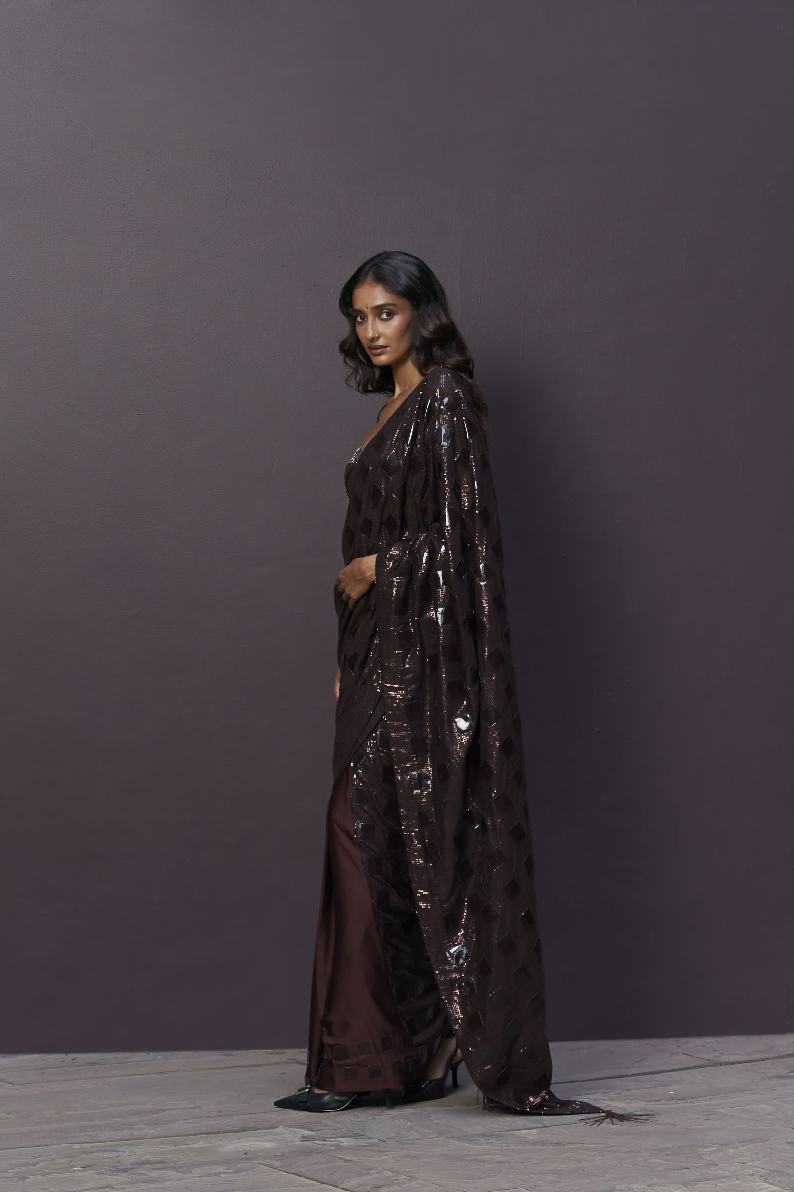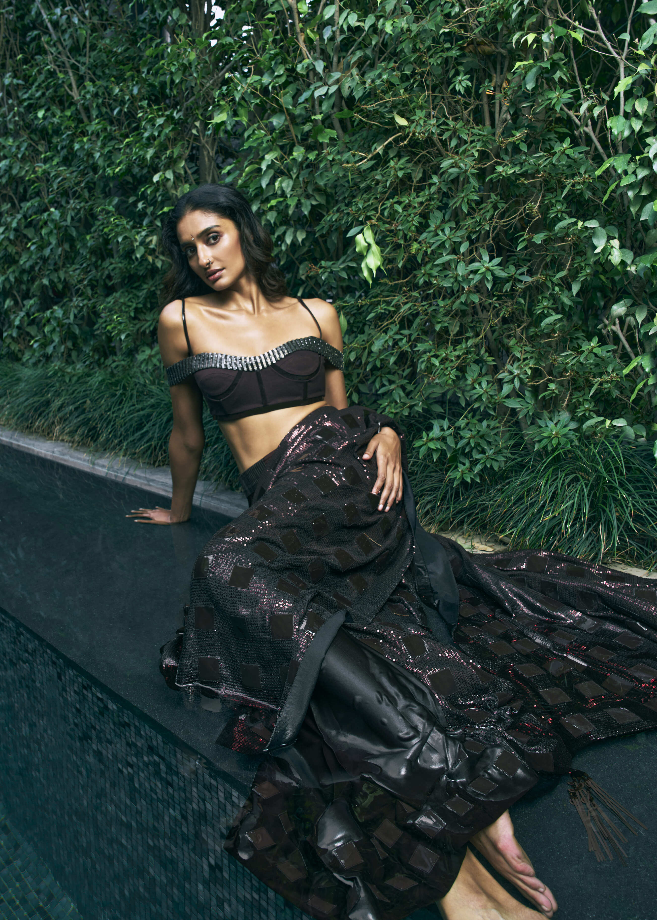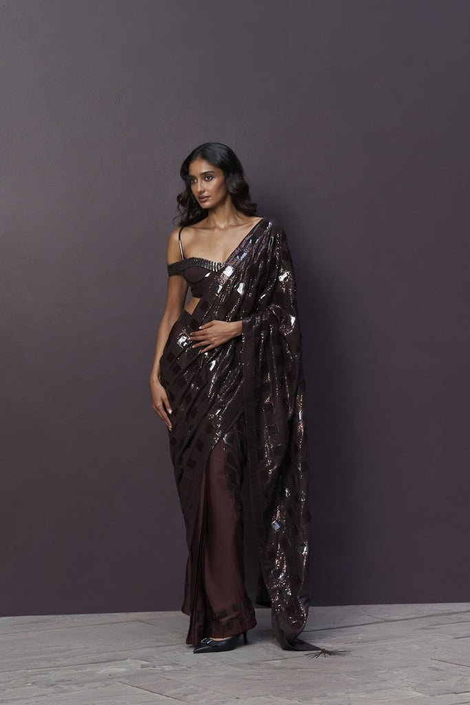 Drenched in chocolate-brown sequins, this drape glows with warmth and depth. The pallu is adorned with glossy faux-leather appliqué, mirroring the sheen of rain on skin, while the georgette satin skirt flows softly with appliqué tracing its hem. A saree that melts, moves, and mesmerizes — pure emotion in motion.