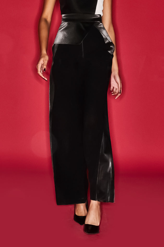 These wide-leg trousers, 'Equinox', feature a luxurious blend of velvety faux leather and rich Japanese crepe panels. The contrasting textures create a visually striking and sophisticated ensemble, while the perfect fit ensures a comfortable and flattering experience. The statement style and vibe of these trousers will elevate your ensemble anytime and anywhere, making you feel confident and stylish.