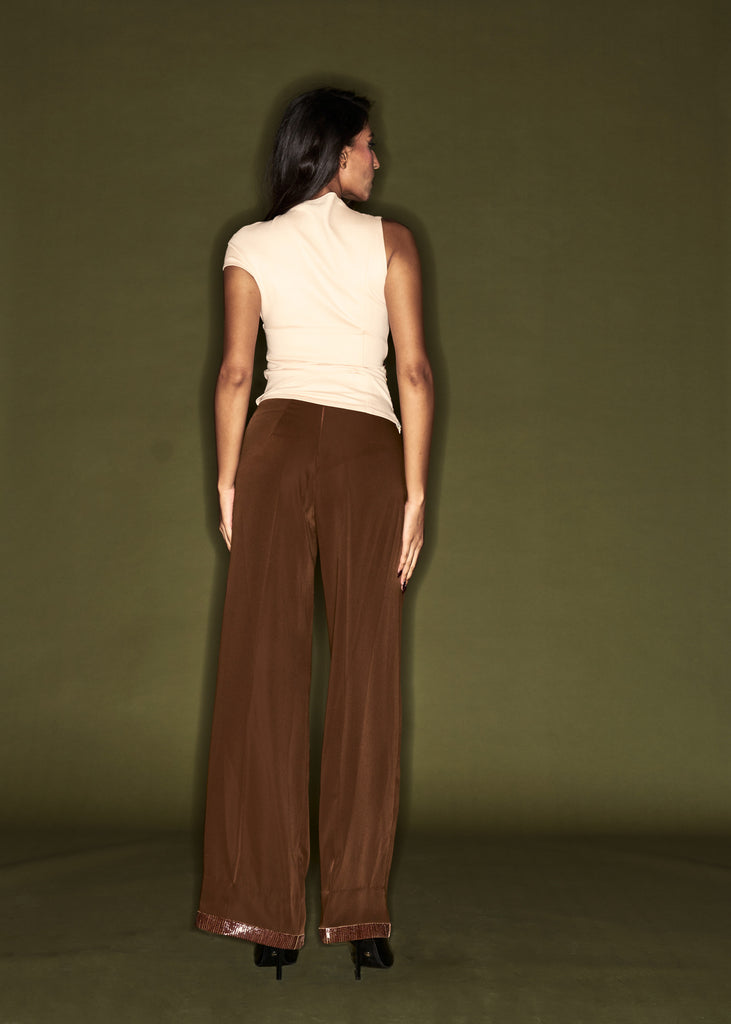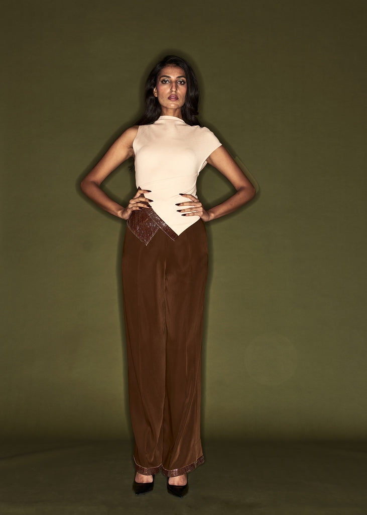 This t-shirt style top, 'Now or Never', is a modern take on a classic silhouette. The unique neckline, and striking wrapping flap crafted from a combination of jersey and glossy faux croc leather create a visually stunning and sophisticated ensemble. The wrapping flap accentuates the wearer's waist, adding a touch of feminine elegance. This piece can elevate your everyday look and make you feel confident and stylish. The contrasting textures and colors add depth and visual interest, making it a versatile piece that can be dressed up or down.