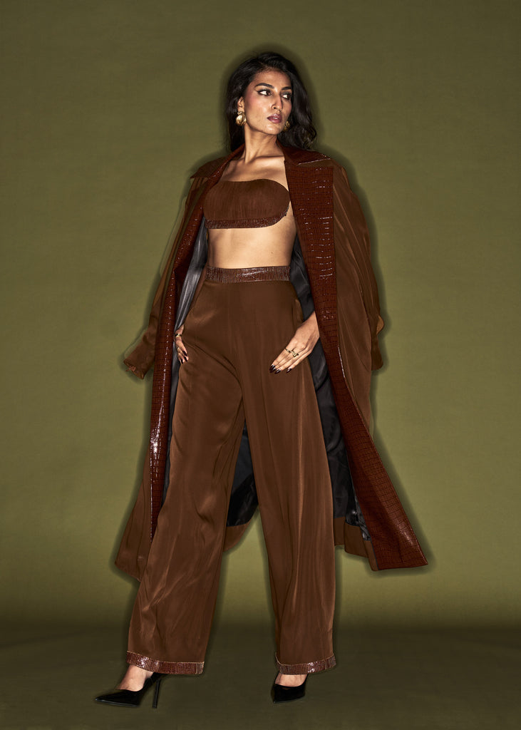 These wide-leg 'Stunna' trousers are a versatile and stylish piece that effortlessly blends comfort and sophistication. The striking details of glossy faux croc leather line panels at the waist and hem add a touch of modern edge and luxury, while the wide-leg silhouette creates a relaxed and effortless feel. The high-quality fabric and impeccable tailoring ensure a luxurious and comfortable experience. These trousers are perfect for a variety of occasions, from business meetings to evening events.