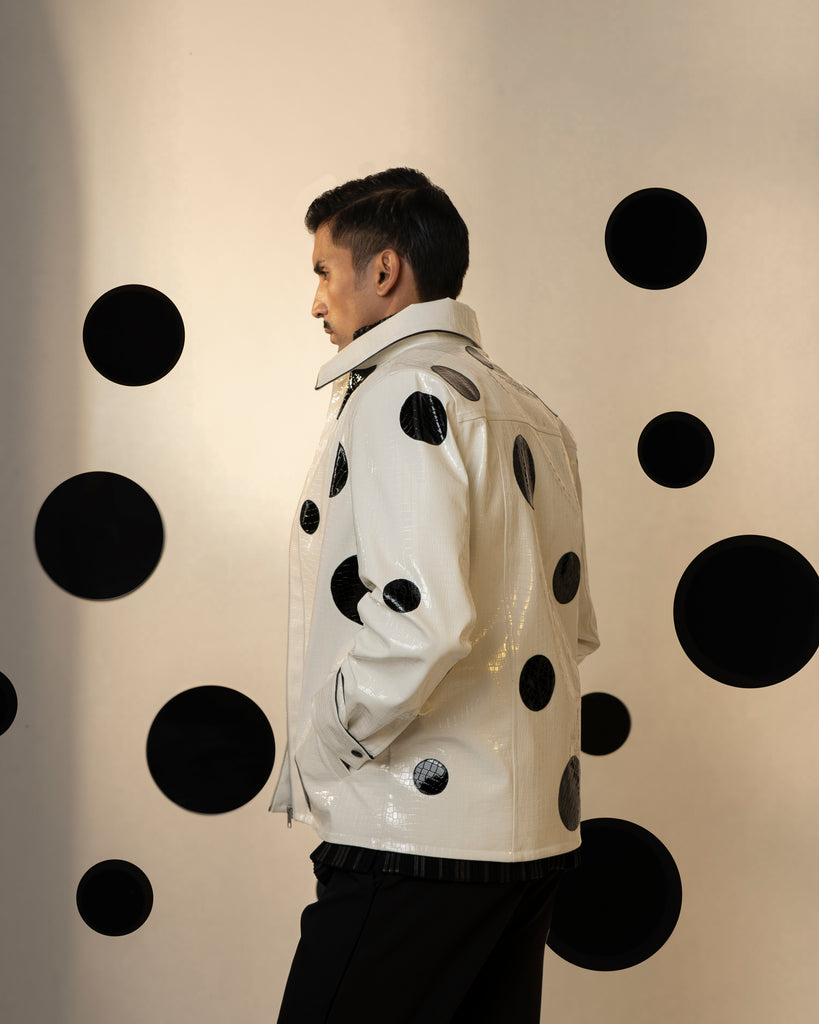 Featuring a faux white croc leather jacket with croc leather polka applique all over.