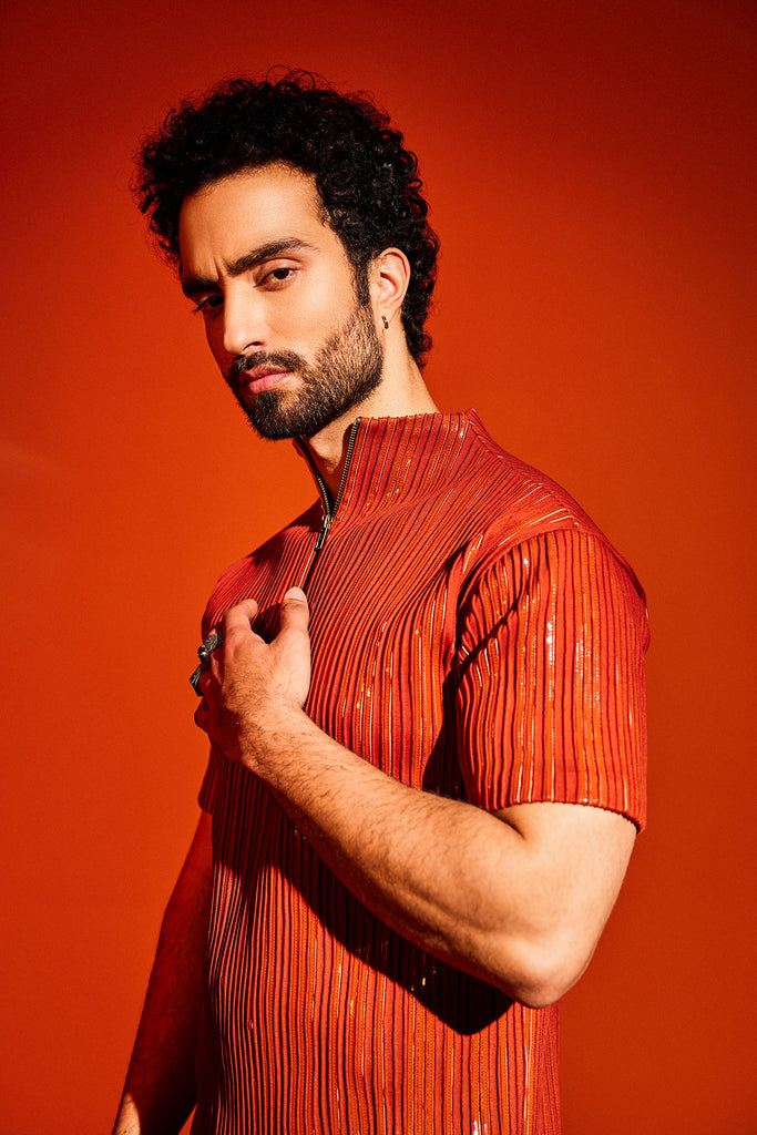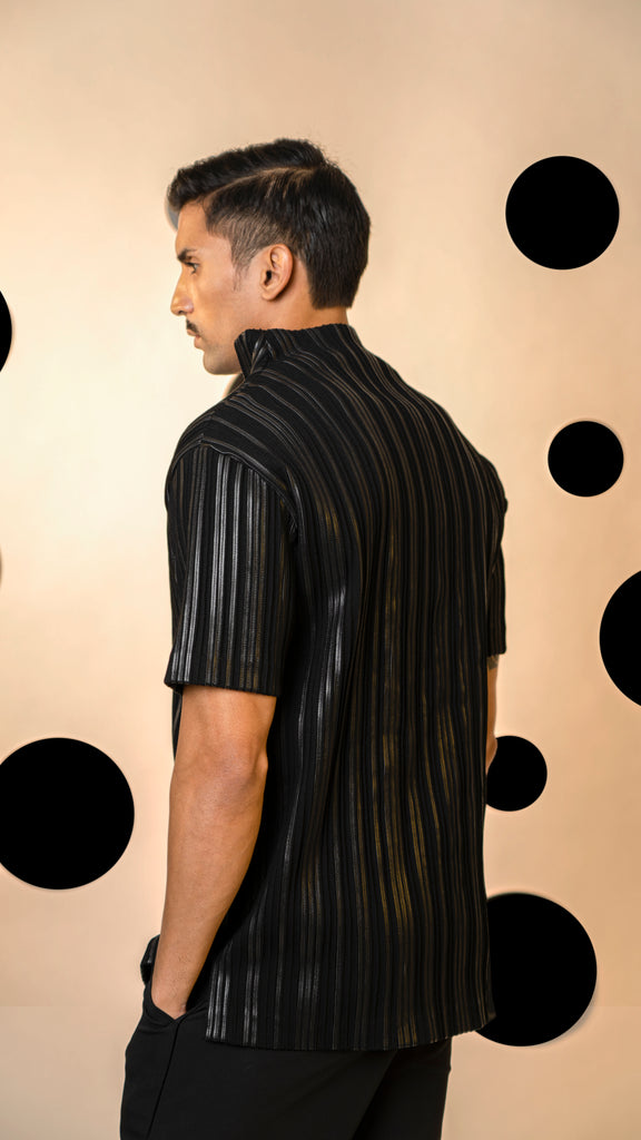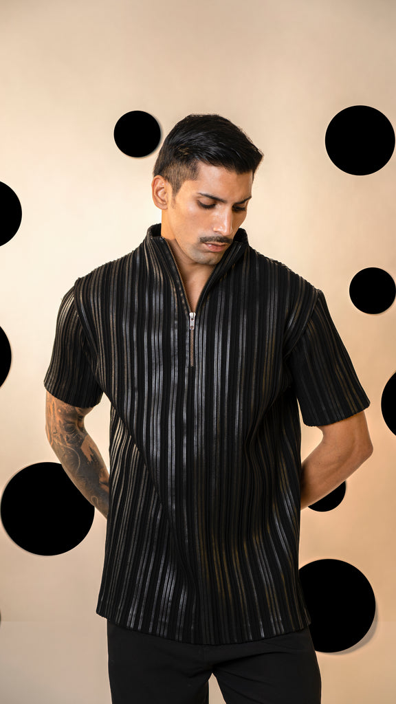 Featuring a black jersey shirt with faux leather vertical line applique all over.