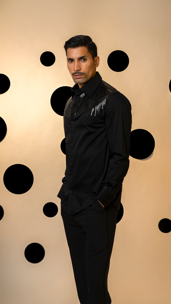 Featuring a black cotton shirt with patent leather line applique from the shoulders vertically.