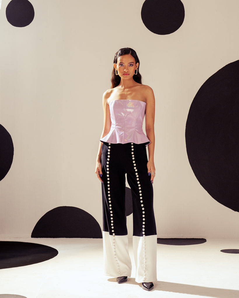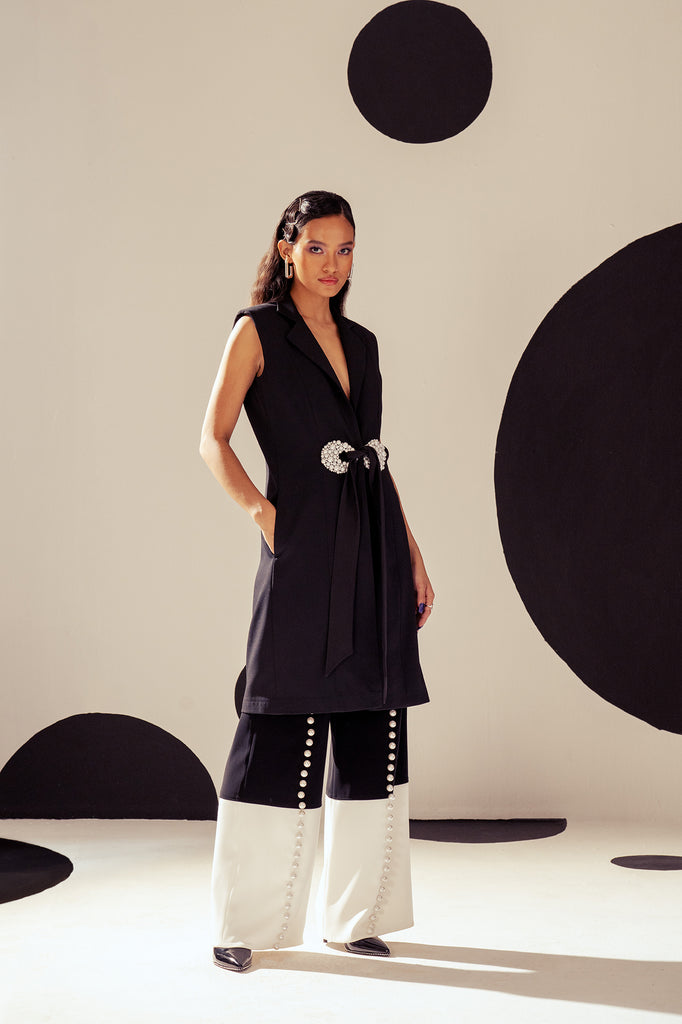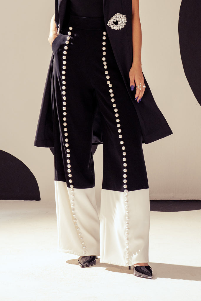 Featuring a dual tone, black and white trousers with center pearl placements and wide fall.