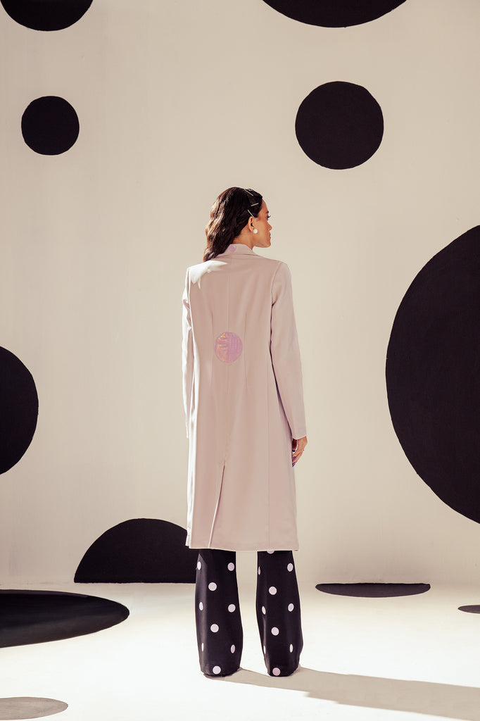 Featuring lilac overcoat with faux leather line polka applique with a tailored fit, a bold and beautiful pick for the upcoming season!