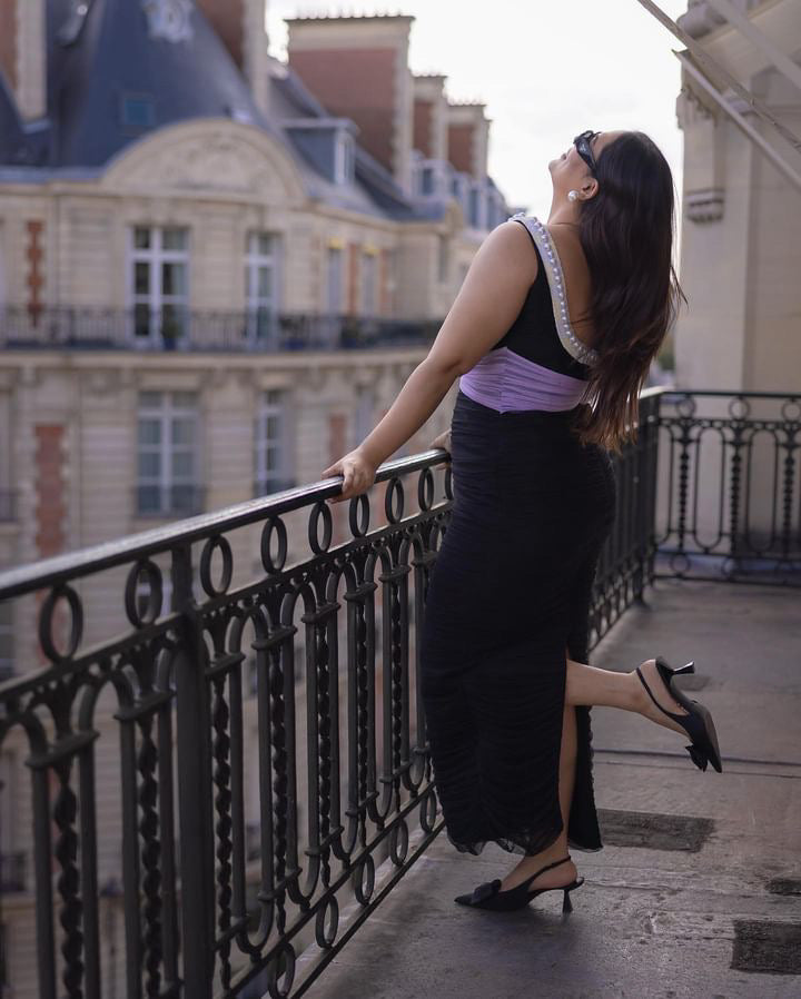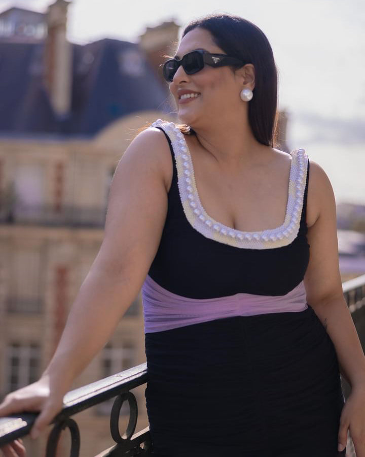 Featuring a dual tone ruching bodycon with a scoop neck heavily embroidered with pearls and waist cinched with black ruching to accentuate the shape and add a colour block detail to the look.