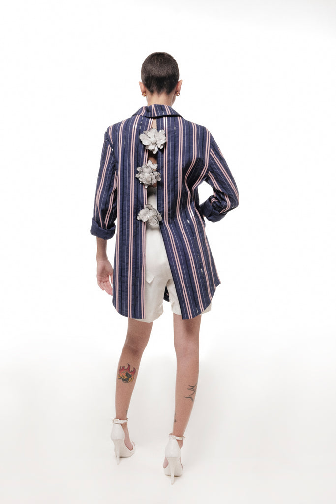 Featuring a long summery collared shirt, heavily textured with pinstripes of blue and pink glossy faux leather lines along a long silt at the back connected with hand crafted sequin flowers making it a must-have shirt for you this summer.HIGHLIGHTS