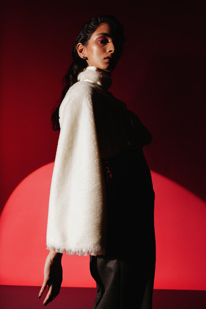 Featuring an Eve shirt with space-tucks detail and faux patent leather piping with ruffle organza inserts on the fur sleeves.
