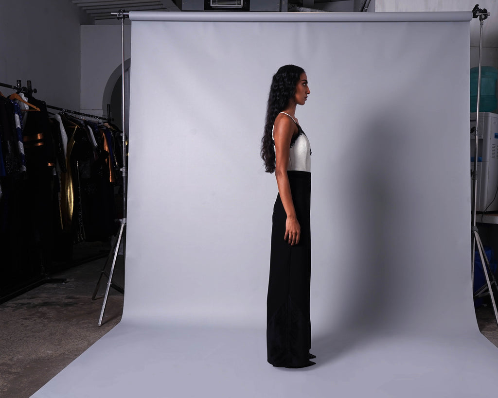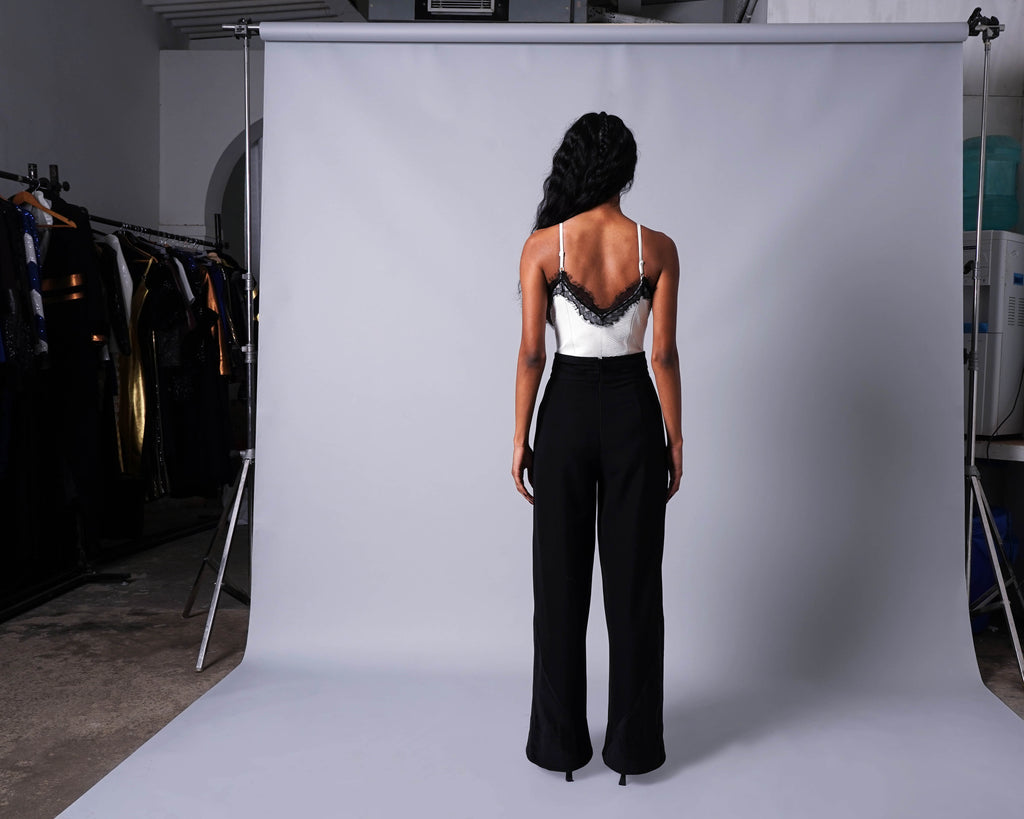 Featuring a classic white bodysuit constructed with stitched leather lines in chevron pattern, adorned with lace trimmings on the edges making it chic and voluptuous at the same time.