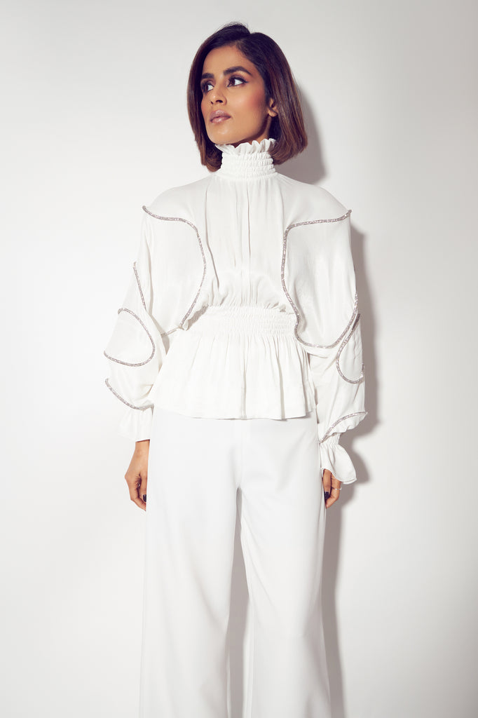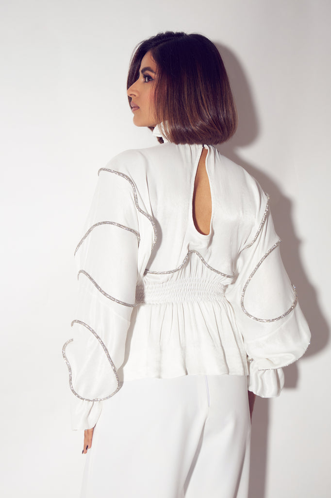 Featuring a satin top with glitter cord stitched all over, with a smocked neck and waist providing a peplum at the bottom hem of the top.