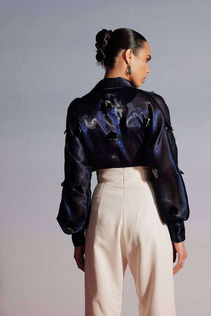 Featuring a radiant organza shirt-bodysuit, Blue Margarita, with the voluminous bishop sleeves and a translucent bodice adorned with the black glossy faux leather applique making it a for a luxe evening wear.HIGHLIGHTS