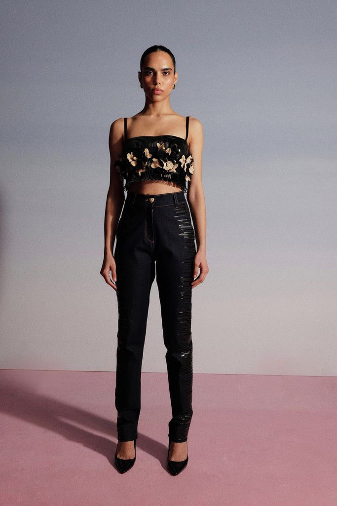| Featuring a crop top textured with glossy faux leatherline as well as mini fringes on the bottom along with sequin embroidered hand-crafted flowers sewn over them. |