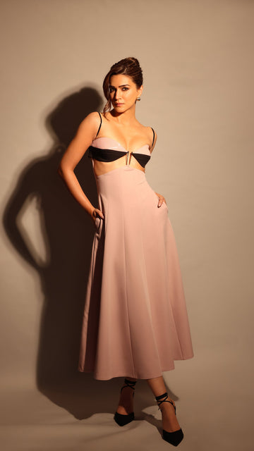 Featuring an A-line dress with a dual-tone cup strap bralette attached to a pink paneled high waist ankle length skirt put together with a sleek U metal trim.HIGHLIGHTS