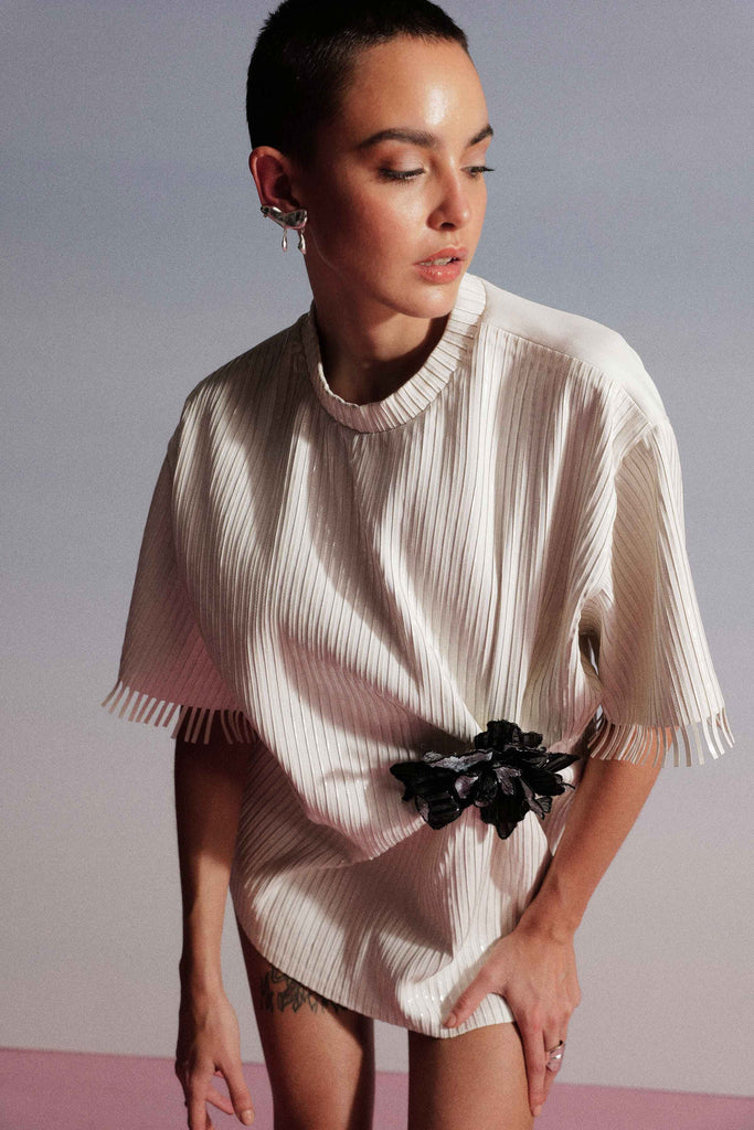 Featuring, a white scrunched T-shirt heavily textured with faux white glossy leather lines and mini fringes at the sleeves, everything put together with a hand-embroidered sequin flower.