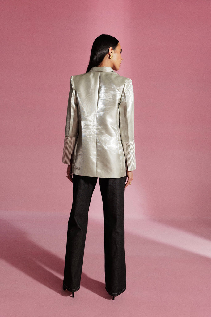 Featuring Scottish Licquorice, the glazed sage oversized blazer with notched collar, made of dutch satin textured with white glossy faux leather lines with accentuated shoulders making it a great semi-formal option.