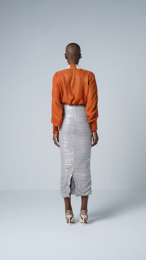 Set sail into elegance with The Cruise Curve Skirt—a high-waisted stunner designed to hug every silhouette like a sea breeze against sun-kissed skin. Draped in shimmering silver sequins that catch light with every step, this skirt glistens like moonlight on open water. The ruched detailing along the centerline adds flattering texture and movement, enhancing curves with effortless grace. Its soft stretch fit ensures comfort while maintaining an ultra-sleek profile from yacht deck to dinner soirée. A subtle back slit allows ease and allure, making each stride a quiet statement. Glide into any setting with this sleek ode to sculpted sophistication.