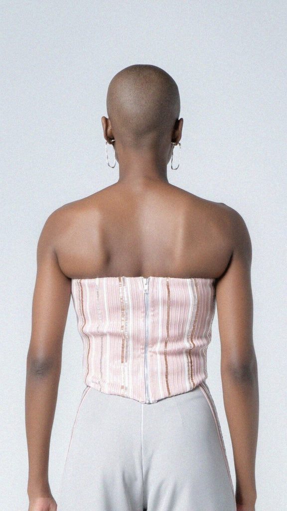 Make a vibrant statement with "The Flamingo Fling Top," a dazzling strapless piece designed to captivate with its playful yet sophisticated charm. This exquisite top features a beautifully structured bodice adorned with lustrous vertical stripes in soft pink and white glossy faux leather lines and shimmering hand-embroidered glass pipe beads, creating an eye-catching interplay of color and texture. The intricate detailing catches the light with every subtle movement, ensuring you sparkle. Its flattering silhouette, with a subtly sculpted hem, offers a modern and elegant edge. Perfect for a chic resort getaway, a lively summer party, or simply when you want to "fling" yourself into a look that's both fun and undeniably glamorous.
