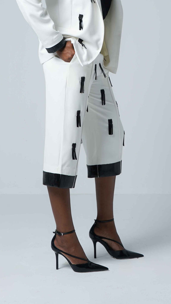 Master the art of effortless chic with "The Girl-Math Culottes," a sophisticated piece that adds smart style to any equation. These crisp white culottes feature a modern, wide-leg cut that offers both comfort and a distinctly fashion-forward silhouette. Their standout design lies in the hand-embroidered black embellishments and sequin fringe meticulously placed down the length of each leg, adding a playful yet luxurious texture that commands attention. With their versatile mid-calf length, they are perfect for seamlessly transitioning from a polished daytime look to an elegant evening affair, proving that looking fabulous can be as simple as "girl math."