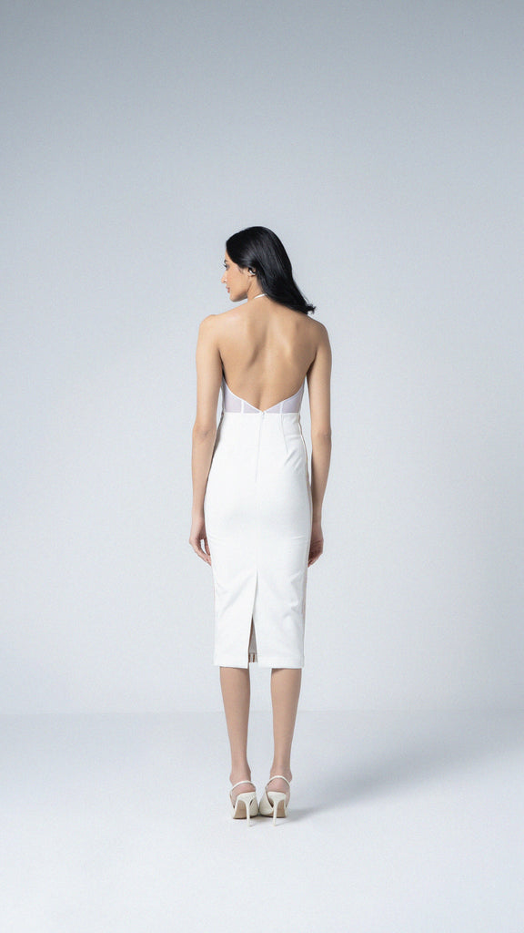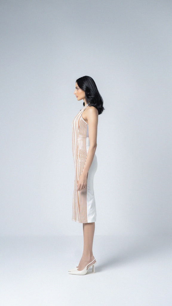 Radiate effortless charm in "The Shine Theory Bodycon," a captivating halter-neck silhouette designed to flatter. This exquisite piece features a daring plunging neckline, drawing the eye and exuding confident allure. Crafted with meticulously hand-embroidered glass pipe beads and sleek leather lines, its vertical striped design in warm, earthy tones creates an elongating and slimming effect. The mid-calf length offers a sophisticated touch, while the back reveals an alluring open design, making it the perfect statement piece for sun-drenched soirees and glamorous evening events.