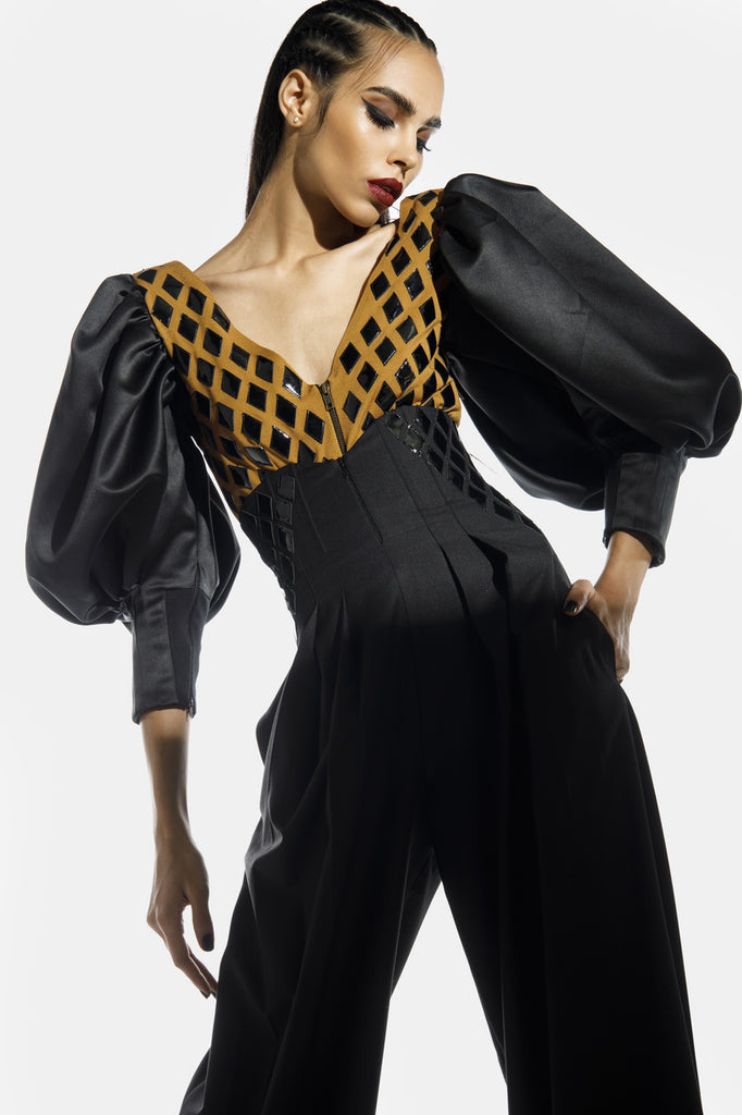 A high-waisted sailor pants with reversed multi-pleats, in a charcoal blend with faux patent diamonds.