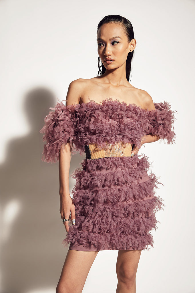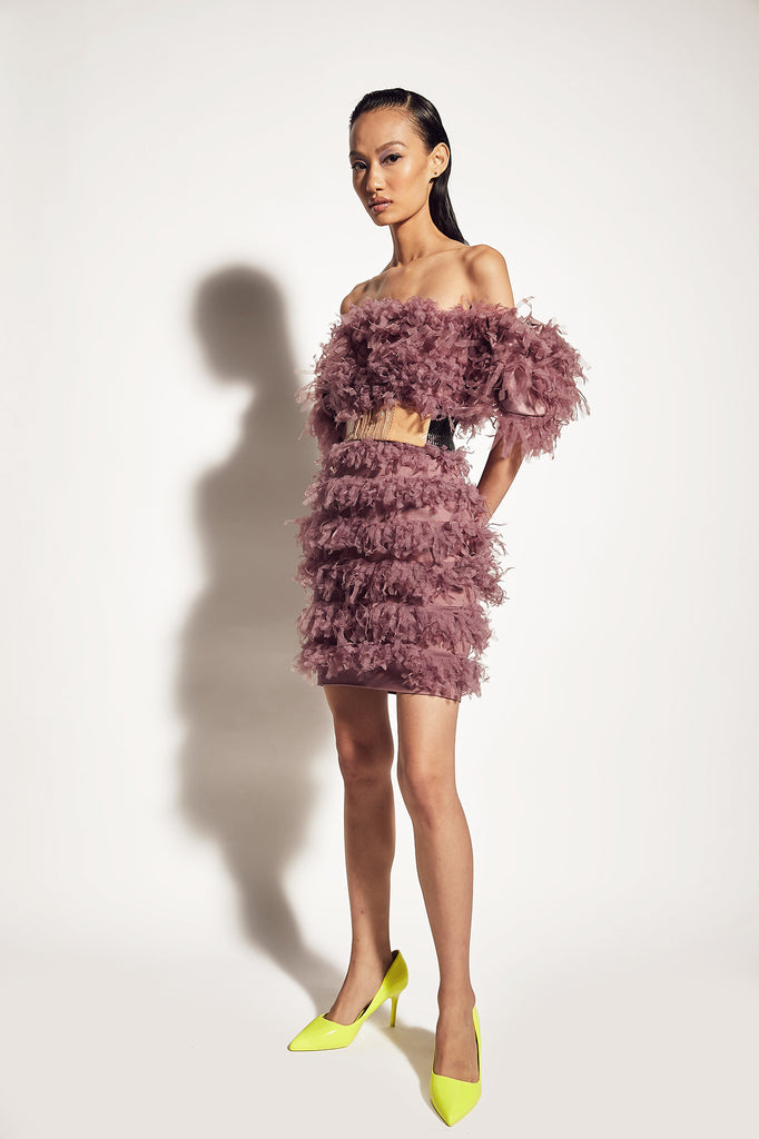 Featuring a mini techna hand tossed organza fringe dress with off-shoulder adjustable puff sleeves and a multi textured belt to style with.
