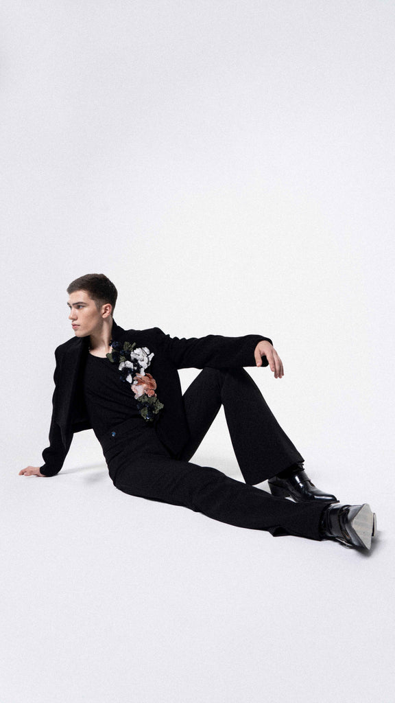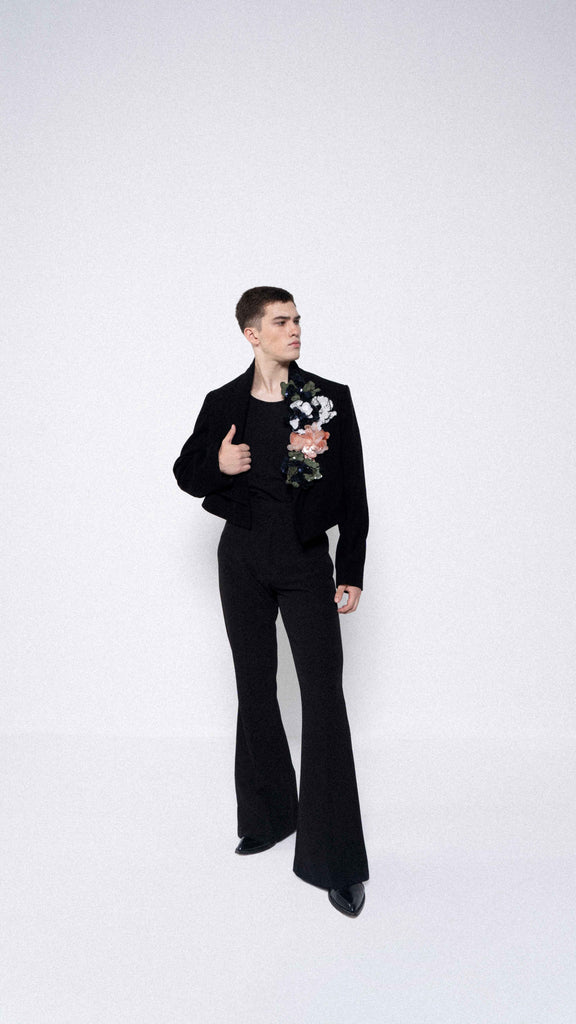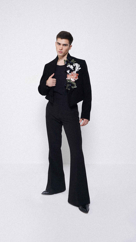 Introducing the stunning Belmont Jewel, a sophisticated black crop open blazer meticulously designed with a striking half upside-down lapel. The blazer features a delicate v-cut hem adorned with intricate and vibrant handmade sequin flowers, adding a touch of elegance and charm to any attire.