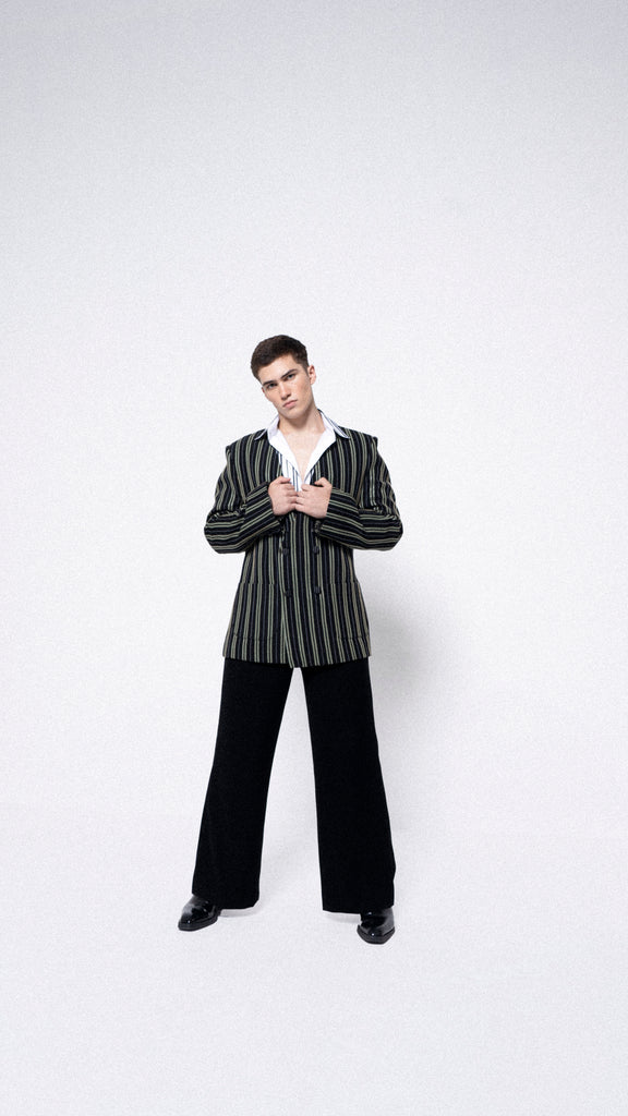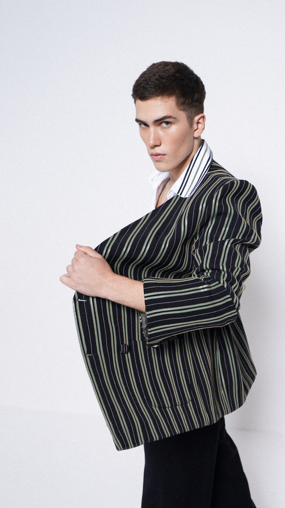Introducing the Bull Shot blazer, a sleek and sophisticated addition to your wardrobe. This black, collarless, double-breasted blazer is adorned with textured pinstripes crafted from glossy sage leather, accented with delicate ice-blue stitches in between. The unique combination of textures and colors makes it a standout choice for a stylish night out with the guys. Its attention-grabbing design is sure to turn heads and make a statement wherever you go.