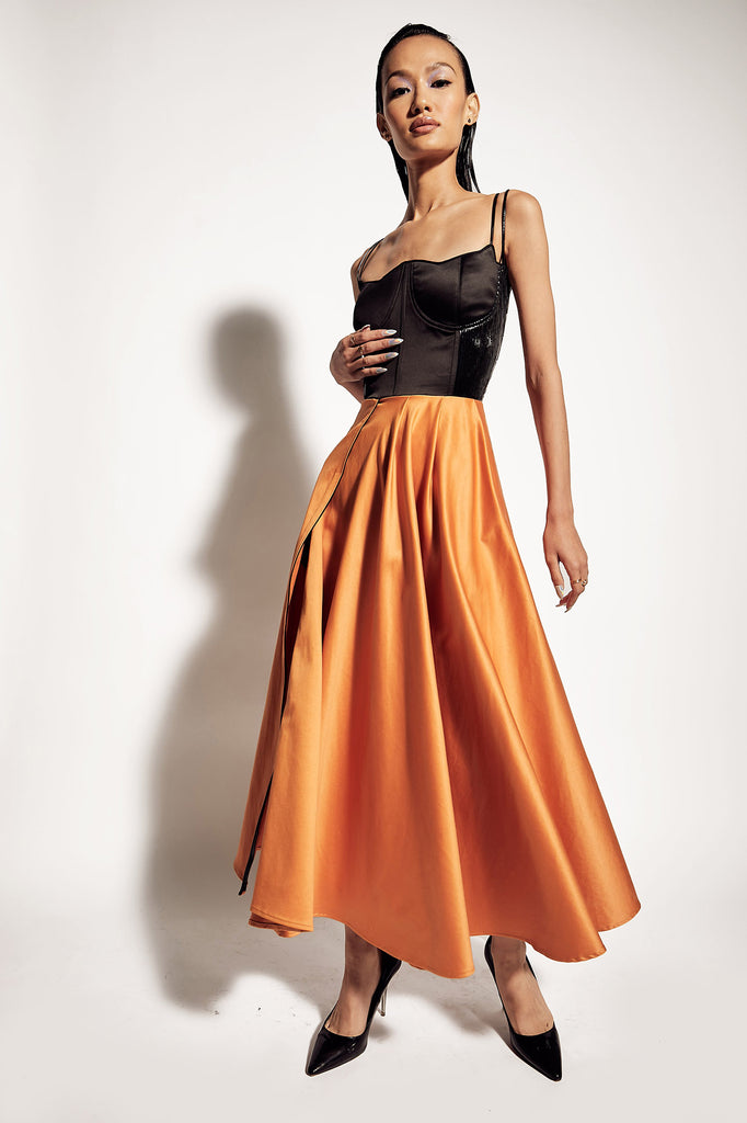 Featuring a unique neckline bustier with faux patent leather line details on the side panels and Stella wrap bottom with patent piping details.
