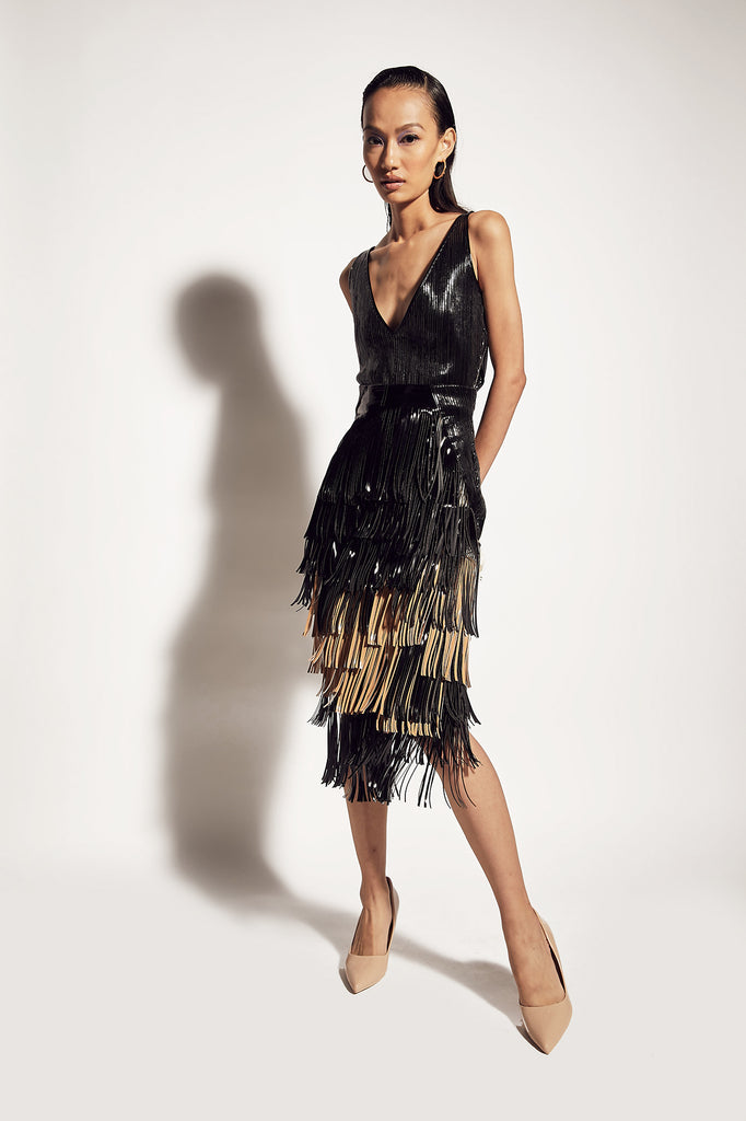 Featuring a black mystic faux patent leather line bodysuit with half mesh panel at the back