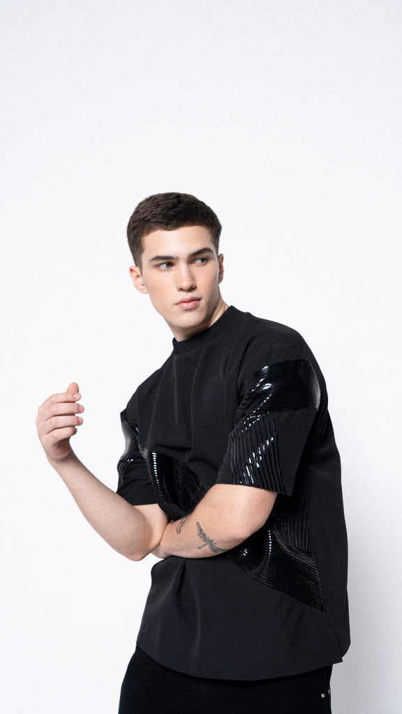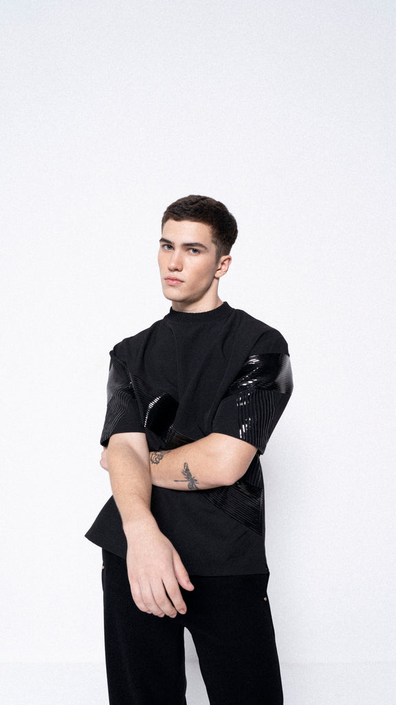 Introducing the Imperial Fizz, crew neck T-shirt, designed with striking glossy faux leather lines that intersect to form a captivating chevron patch spanning across the front and sleeves. This unique design adds a bold and stylish element, making it a standout piece for any wardrobe.