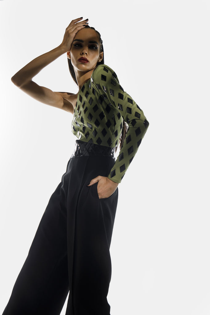 A close proximity set of flared daks and one-sleeve top with diamond surfacing.