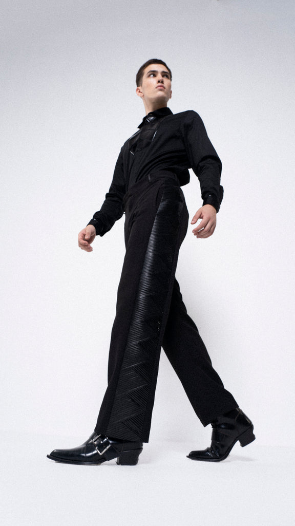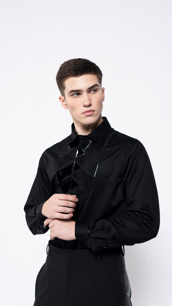 Introducing the "Shirley Temple", black cotton full-sleeve shirt, a timeless piece that exudes elegance and sophistication. Its intricately crafted bib features heavy texturing of black glossy faux leather chevron details, adding a touch of luxury and making it a truly standout garment.