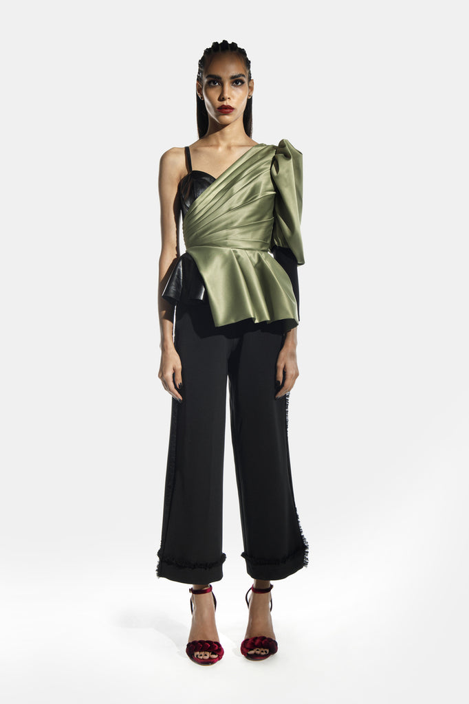 Featuring a two-faced top with a hidden bustier, gathers on top and puffed, two-panelled sleeves.