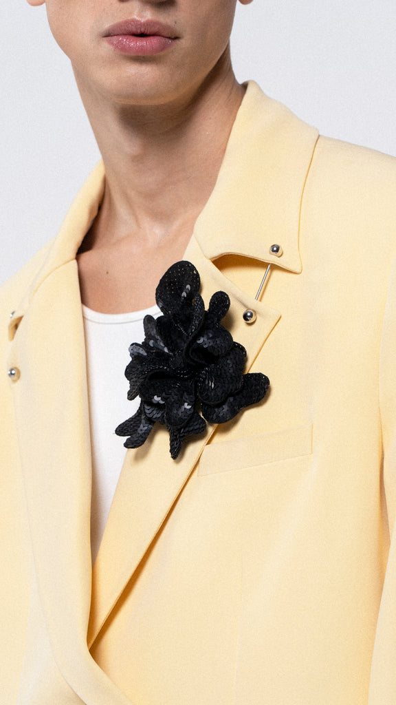 Introducing the Long Beach Tea, a vibrant yellow double-breasted blazer designed to make a statement. Crafted with intricate yellow matte faux leather lines on the cuffs and adorned with silver metal piercings on the lapel notches, this blazer is perfect for adding a touch of personality to your party ensemble. The unique detailing and bold color make it a fun and fashionable choice for any special occasion.