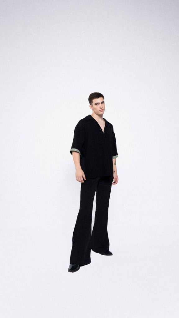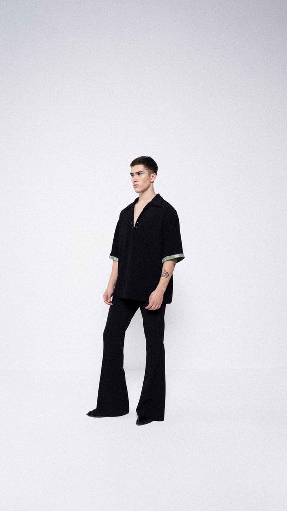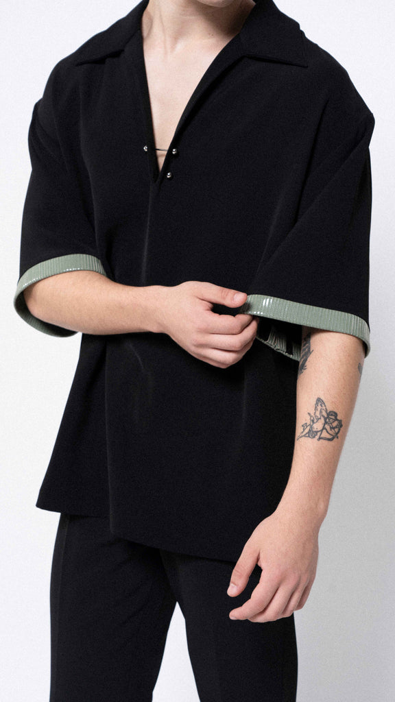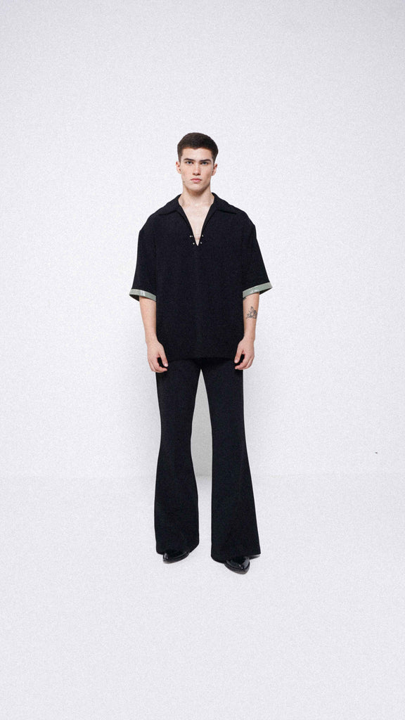 The Rob Roy T-shirt is designed with a stylish Cuban collar and features leather-lined detailed folds on the sleeves. Additionally, it is adorned with metal piercings on the neckline, adding a touch of edgy flair. This unique combination of design elements makes it an ideal choice for a brunch outfit.