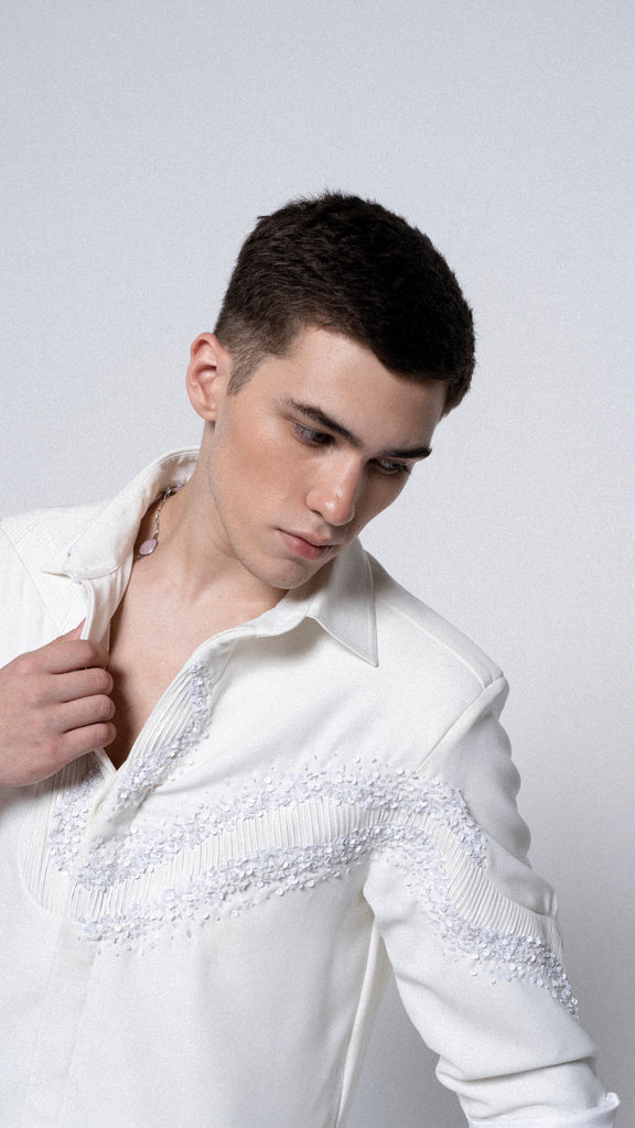 Introducing "Seven and Seven" - a stunning jacket designed with a glossy white faux leather swirl gracefully adorning the front and sleeves. The intricate beauty of the jacket is further enhanced with exquisite sequin hand-embroidery, adding a touch of elegance and charm to the garment.