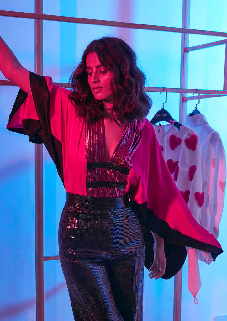 you still writing poetry for the guy you’ve fallen for? Well, let me show you poetry; this BODYSUIT! You see how the foil fabric pleated just rhymes with the cape silhouette of the bodysuit? And the final punchline is the faux leather straps below the neckline. Dude, I want this asap!
