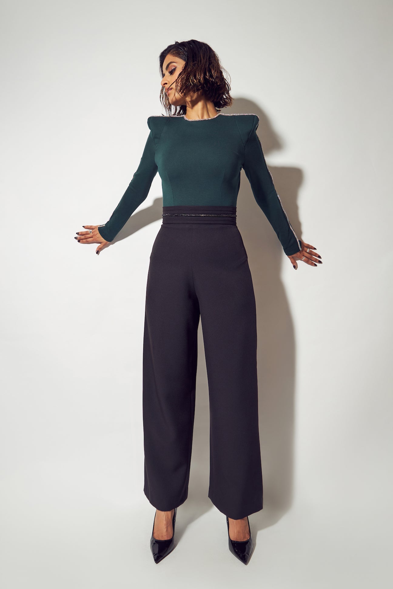 Featuring a classic flared trouser with pintucks details and embellished glitter cord stitched on the waistband