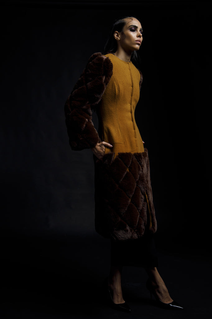 Featuring a neat scotch sleeveless gilet with brown faux fur diamond applique.