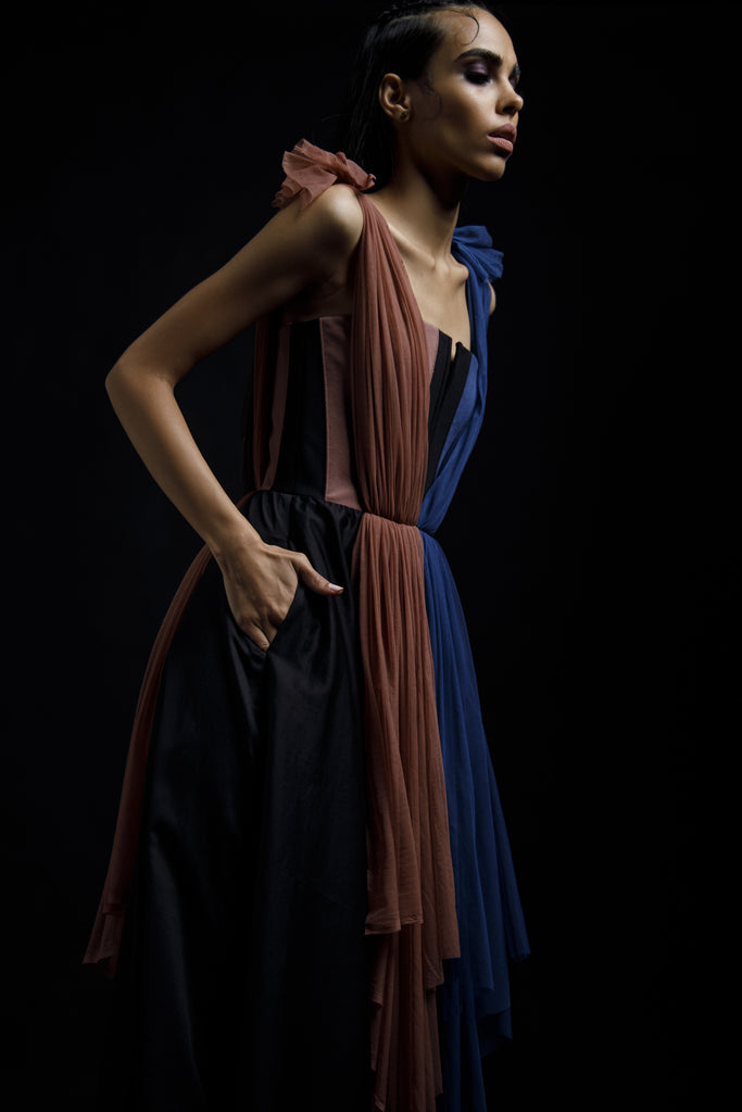 Featuring an A-line cotton dress with gathered tulle colour block detail.