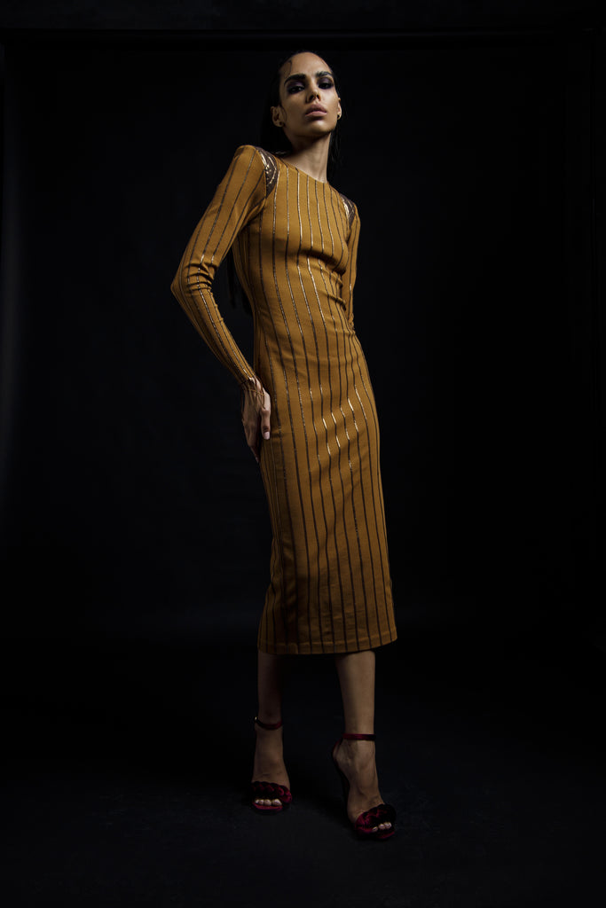 A champagne dress with power quilt shoulders and vertical glazed stripes.