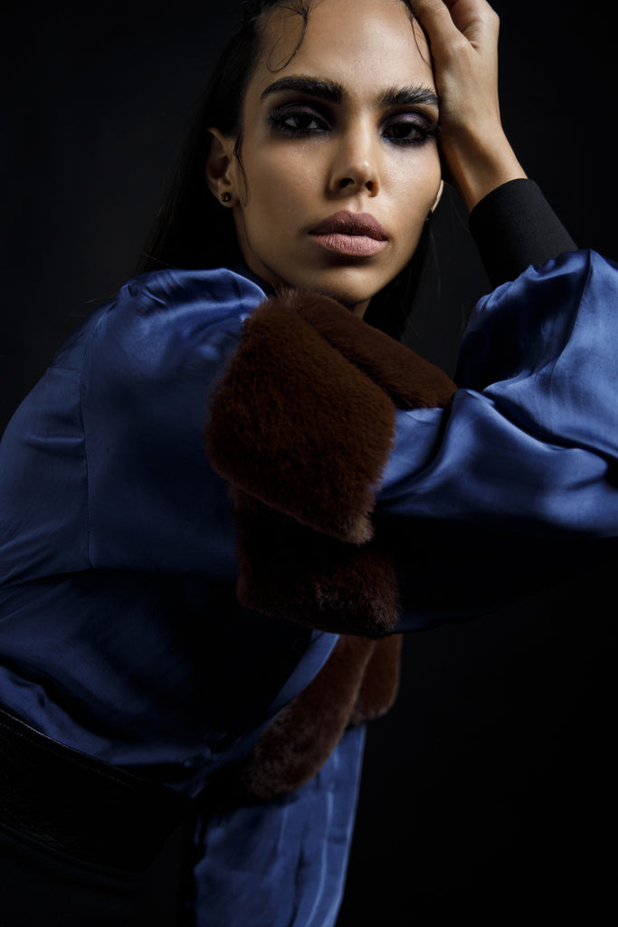 An Indigo satin shirt with faux brown fur sleeve detail.